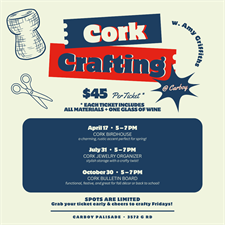 Uncork your creativity and get a little crafty with us! Join Carboy Winery for a hands-on Cork Crafting workshop led by local maker Amy Griffiths. Each Friday evening session features a unique, seasonal cork craft, perfect for adding a handmade, wine-inspired touch to your home.